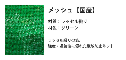 | 材質 | ラッセル織り ※ラッセル織りの為、強度・通気性に優れた飛散防止ネット |