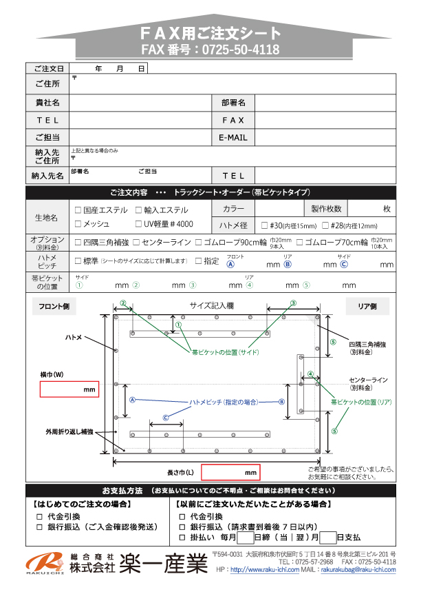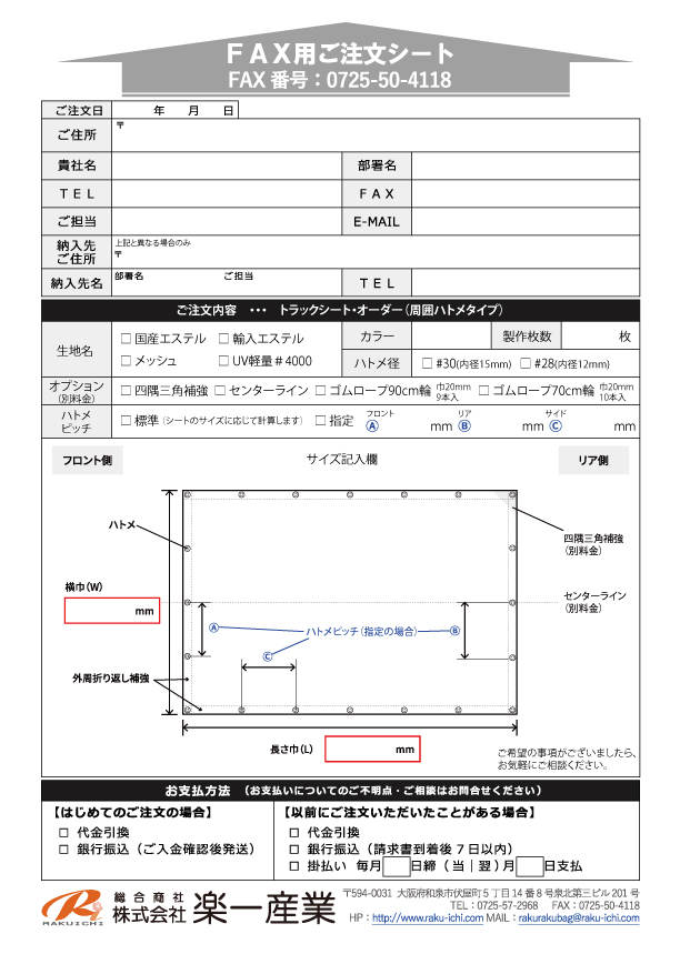 | ◎ 社名、ロゴ入れなど ◎ サイズ変更 ◎ 仕様変更(ハトメ位置、ペケット位置変更、補強仕様など) ◎ カラーオーダー(※防音シートの場合は、最小ロット要お問い合わせ) どんなご要望もあきらめずご連絡ください! |