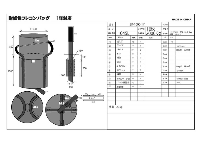 | 商品名 | 耐候性フレコンバッグ 1年対応 反転ベルト付き |